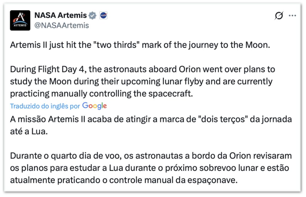 A Nasa informou ainda que a missão segue dentro do planejado, com a trajetória mantida sem necessidade de correções adicionais até o momento. Em publicação na noite de sábado (4.abr), a agência afirmou que a missão atingiu a marca de dois terços do percurso até a Lua. Os astronautas passaram o 4º dia de voo revisando os planos científicos e treinando o controle manual da espaçonave.