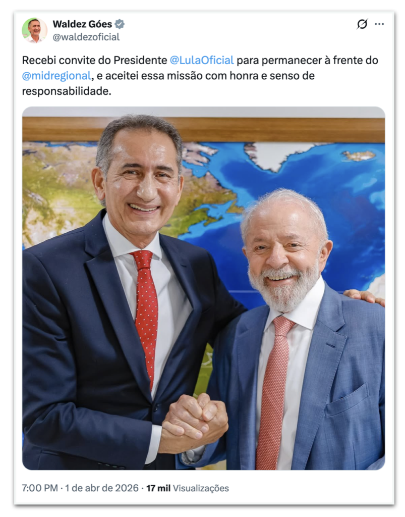 Em publicação em seu perfil no X, na 4ª feira (1º.abr.2026), o ministro afirmou que recebeu de Lula o convite para permanecer à frente do ministério. “Aceitei essa missão com honra e senso de responsabilidade”, escreveu.